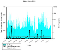 In Elliot Ditch, total suspended solids concentrations typically measure below the target concentration. In Elliot Ditch, total suspended solids concentrations exceed target concentrations in only 15% of samples during the sampling period. Although peak total suspended solids concentrations do not coincide with peak flows, TSS concentrations typically increase during higher flow conditions and reach concentrations as high as 172 mg/L. This is to be expected as increases in TSS following storm events suggests that stormwater carries larger amounts of dissolved and suspended solids than is present during base flow conditions. Higher overland flow velocities typically result in an increase in sediment particles in runoff. Additionally, greater streambank and streambed erosion typically occurs during high flow. Therefore, higher total suspended solid concentrations are typically measured in storm flow samples. In Elliot Ditch, five peak total suspended solids concentrations were measured with two of these exceeding the target concentration by an order of magnitude.